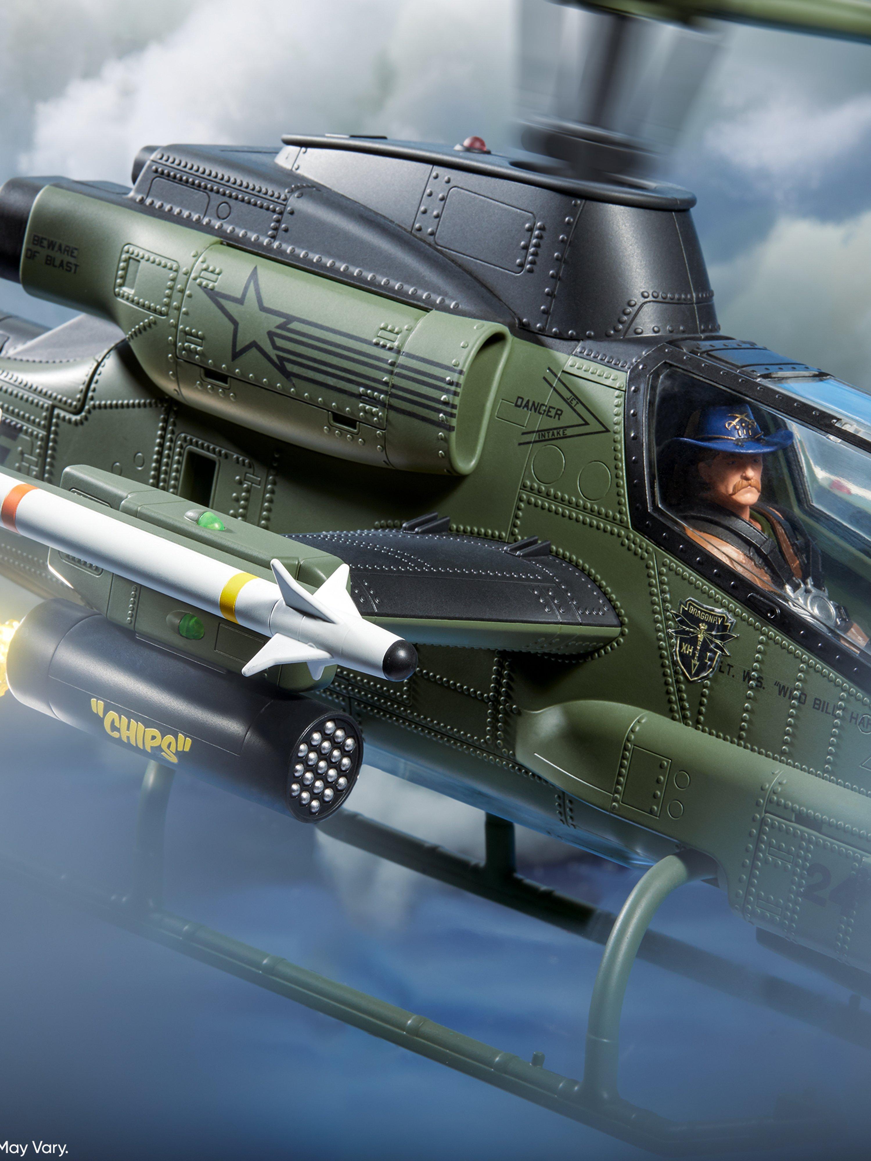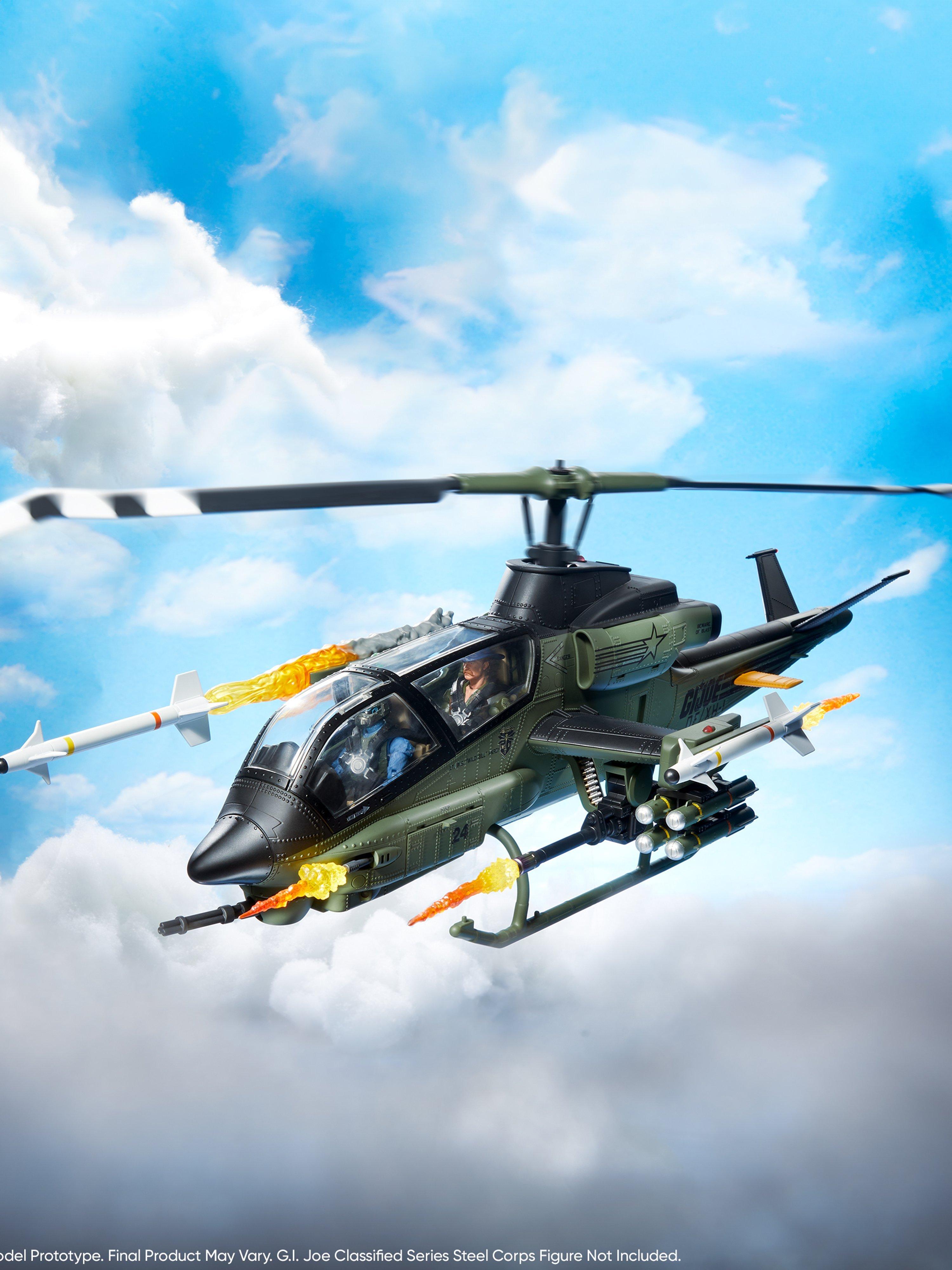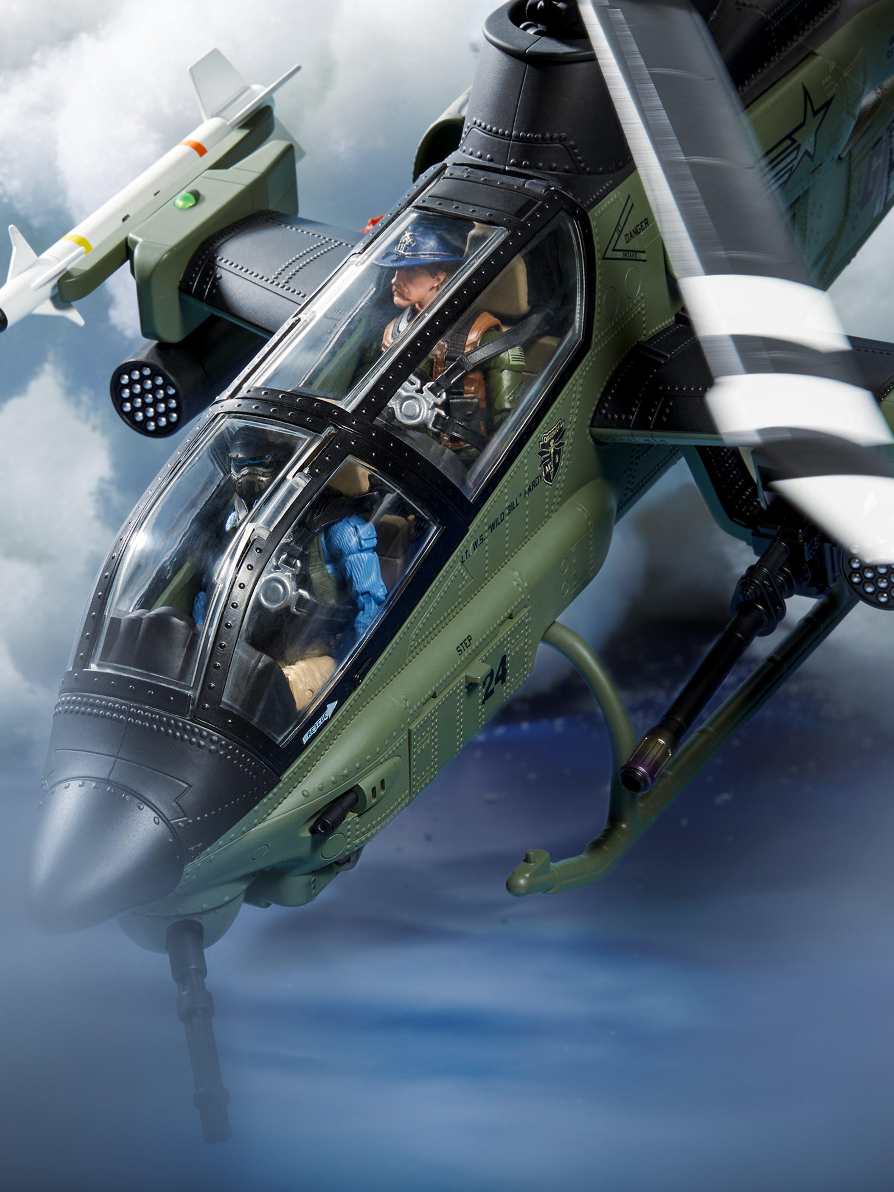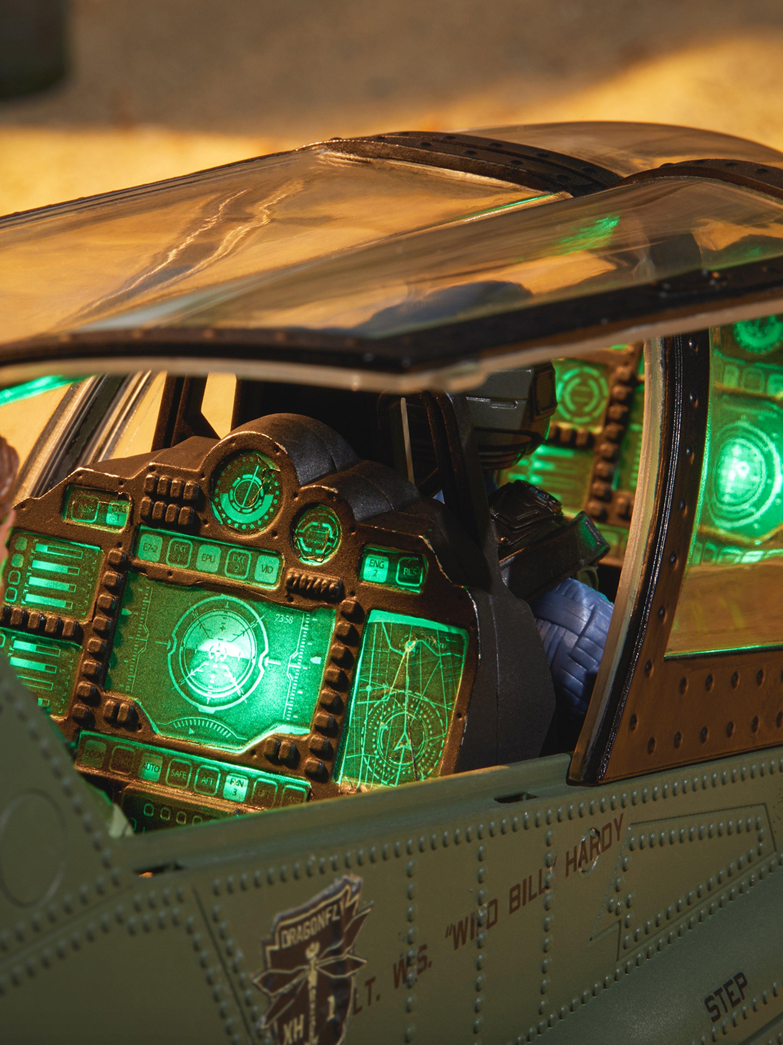 · Elaborately-detailed Command Cockpit Interior: The copter pilot and gunner sit buckled with a 4-point harness in front of specialized illuminated instrument control panels. You can pose each figure operating the center, floor-mounted control stick and throttle controls maneuvering around and locking in on an oncoming H.I.S.S.