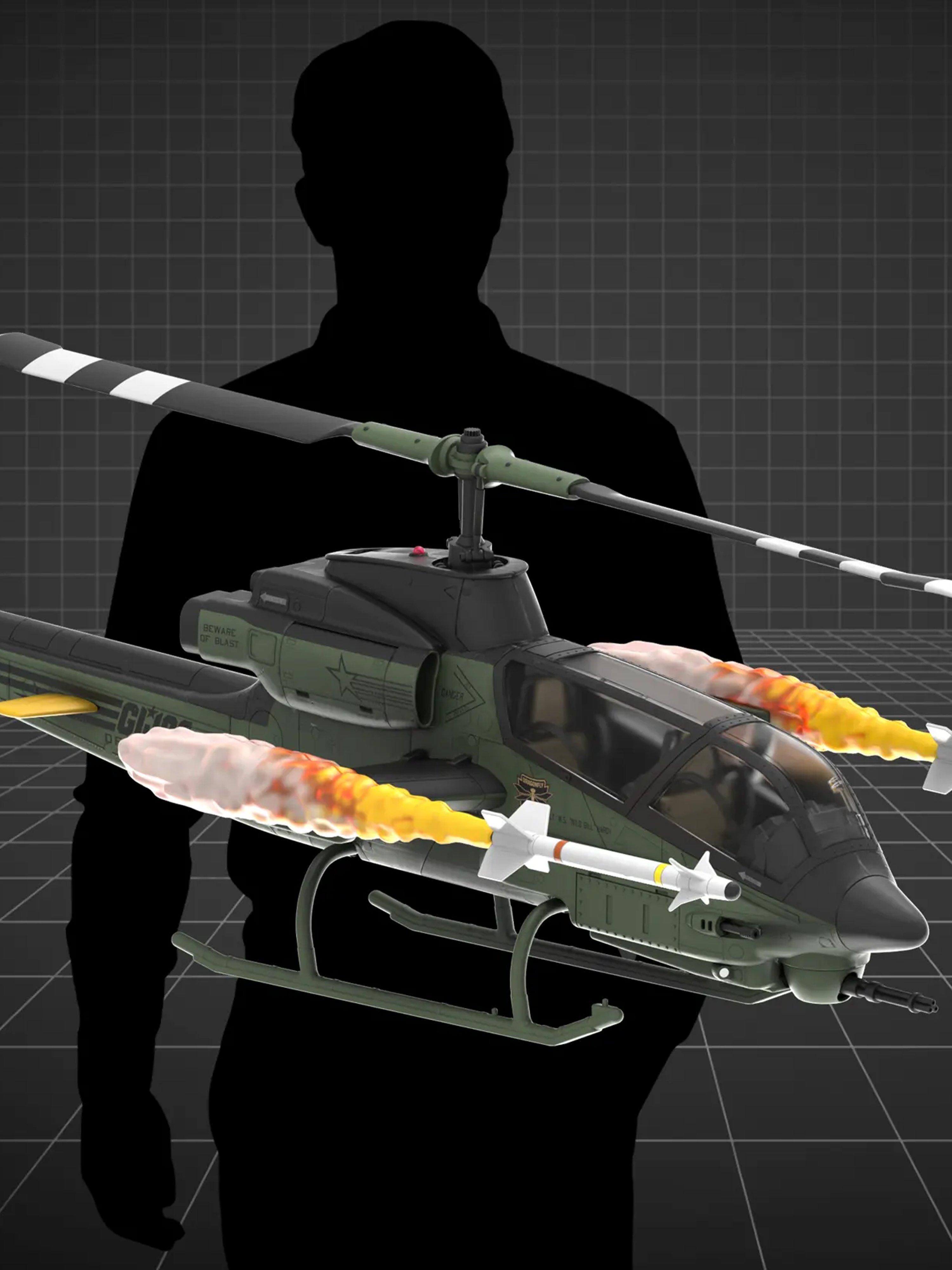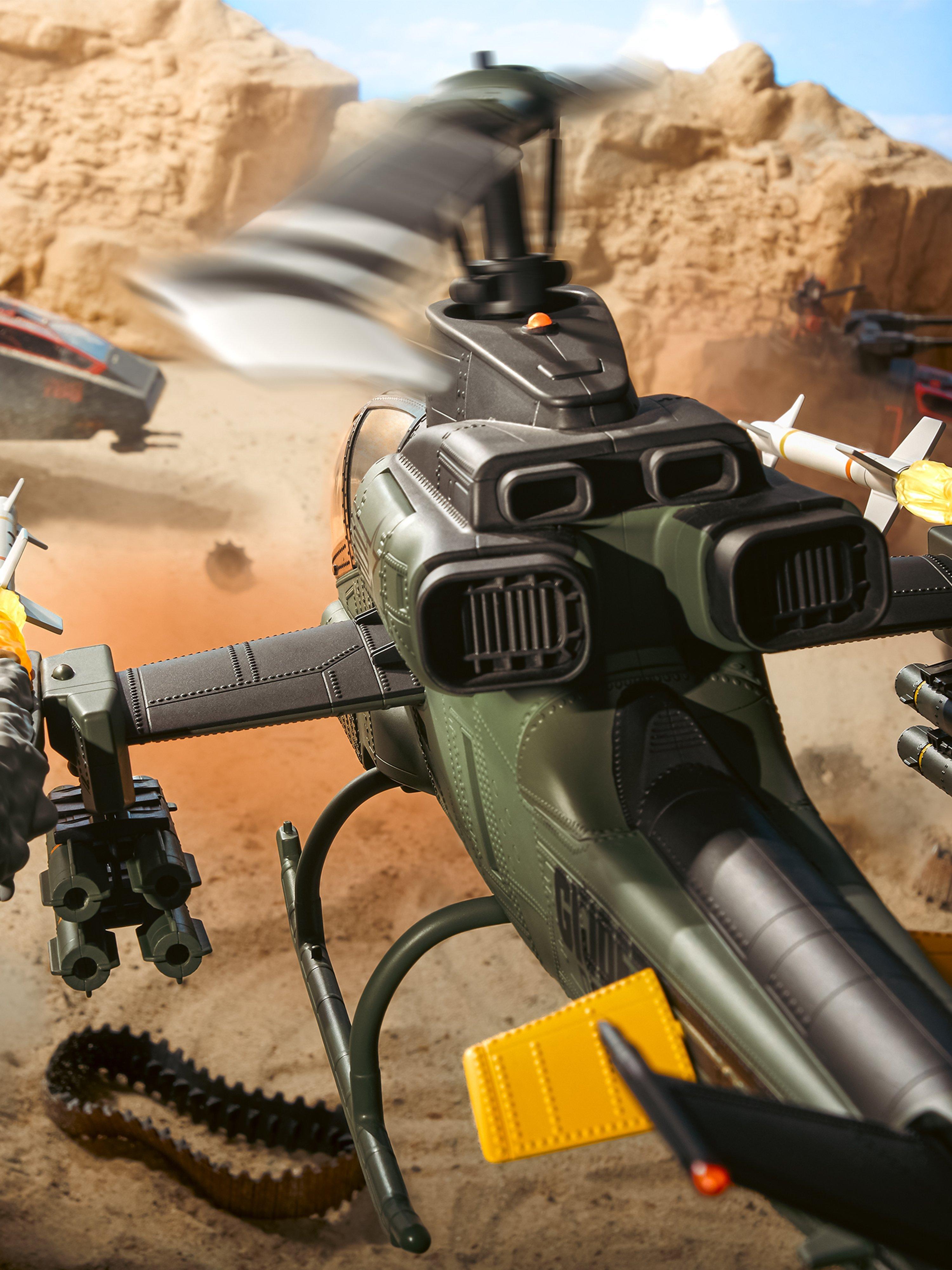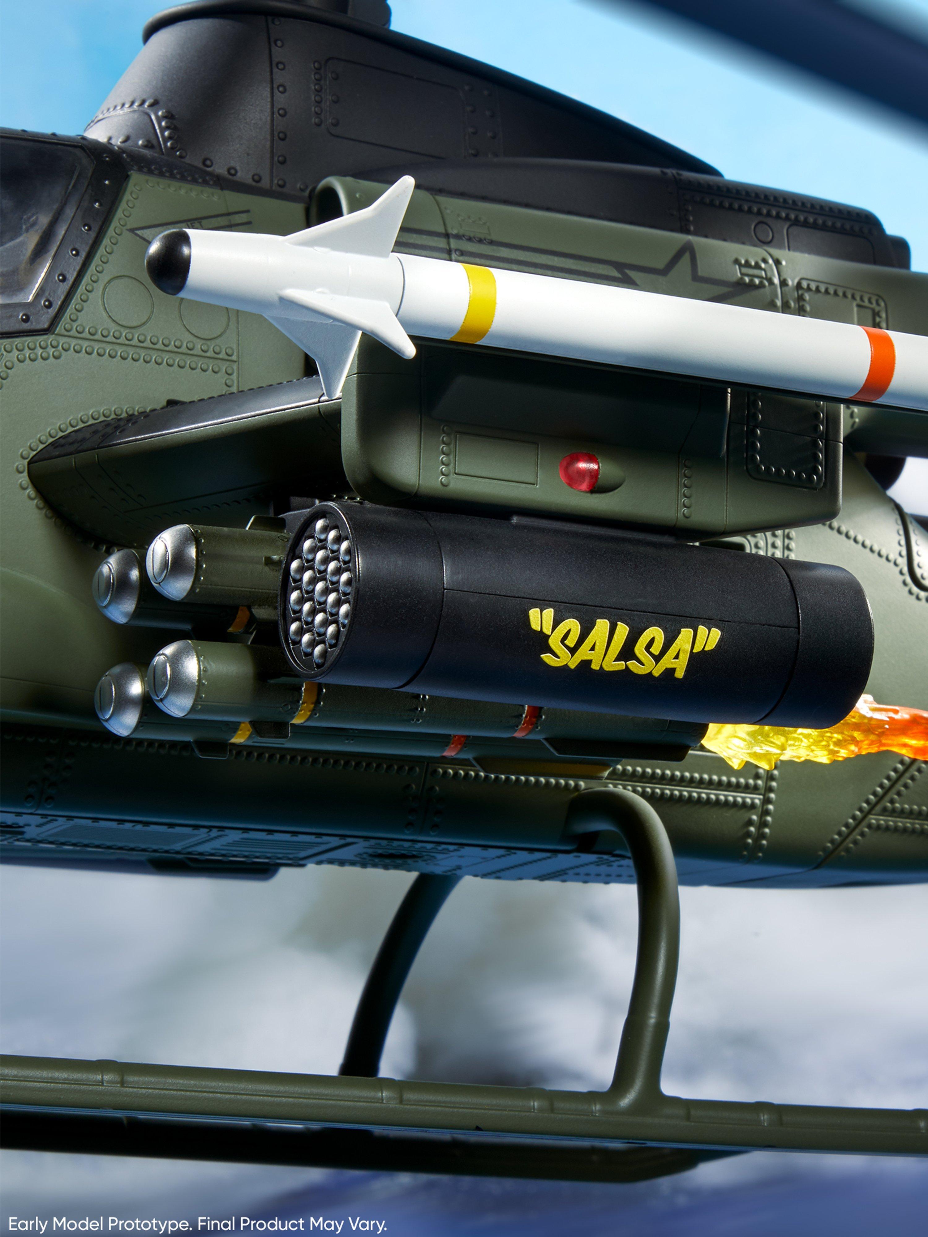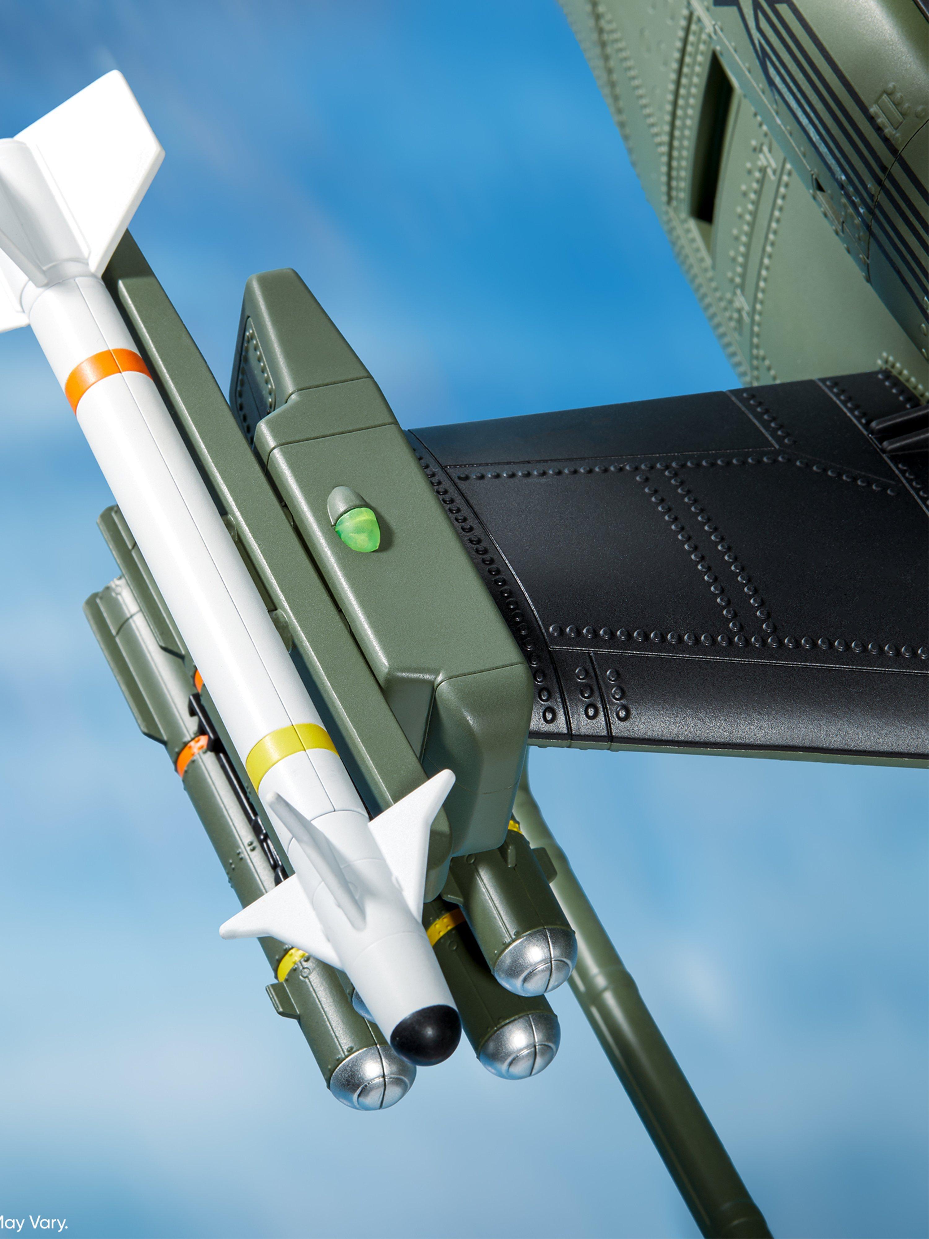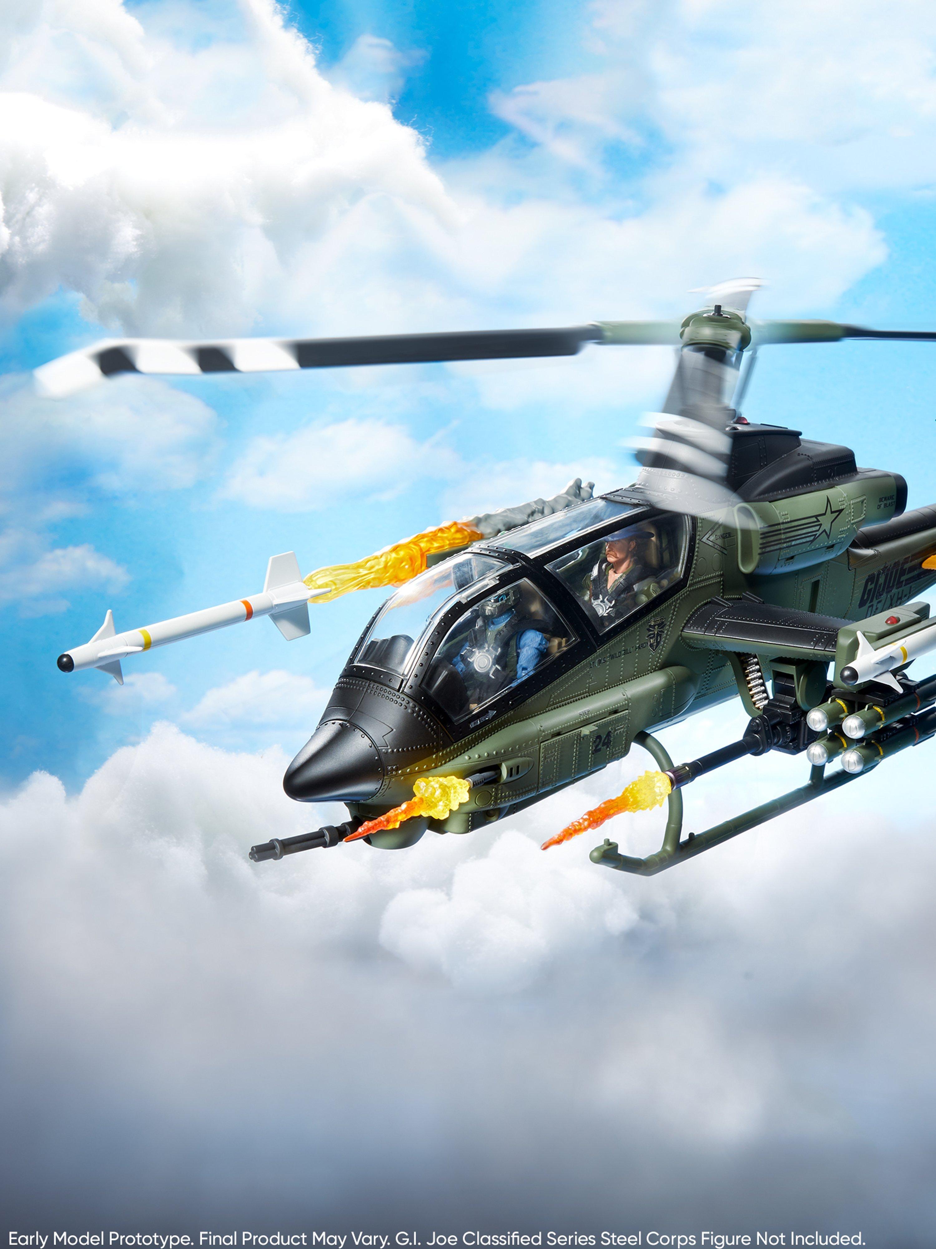 · Elaborately-detailed Command Cockpit Interior: The copter pilot and gunner sit buckled with a 4-point harness in front of specialized illuminated instrument control panels. You can pose each figure operating the center, floor-mounted control stick and throttle controls maneuvering around and locking in on an oncoming H.I.S.S.