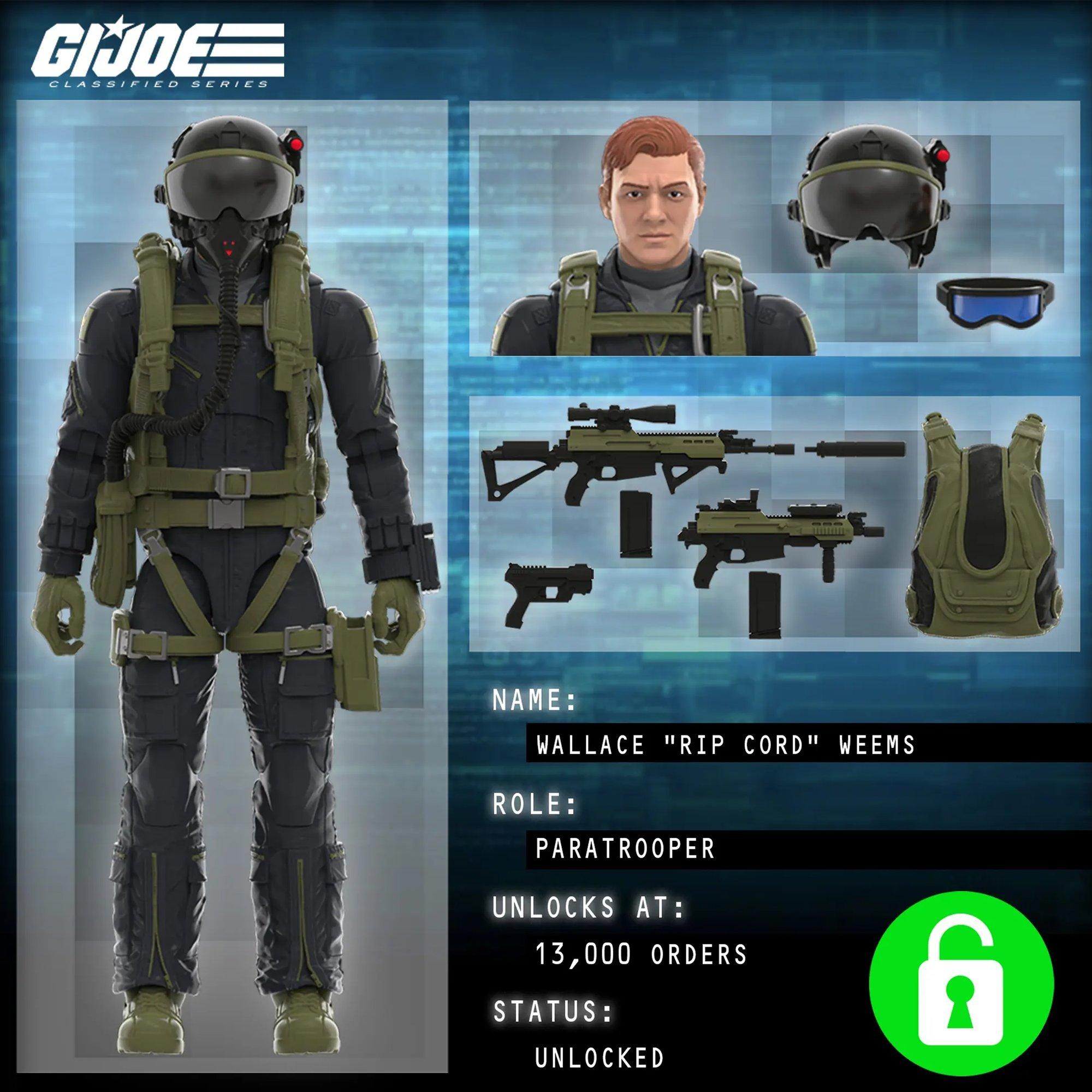 If the Campaign reaches 13,000 orders before 4:59 AM BST on July 18th, backers will unlock a G.I. Joe Classified Series Night Force Rip Cord figure. The G.I. Joe HALO (High Altitude Low Opening) Jumper comes equipped with helmet, goggles, altitude gauge, rebreather, backpack, and 3 weapon accessories. This figure comes individually boxed with his own artwork and number in the G.I. Joe Classified Series sequence and will only be available through this HasLab offering.